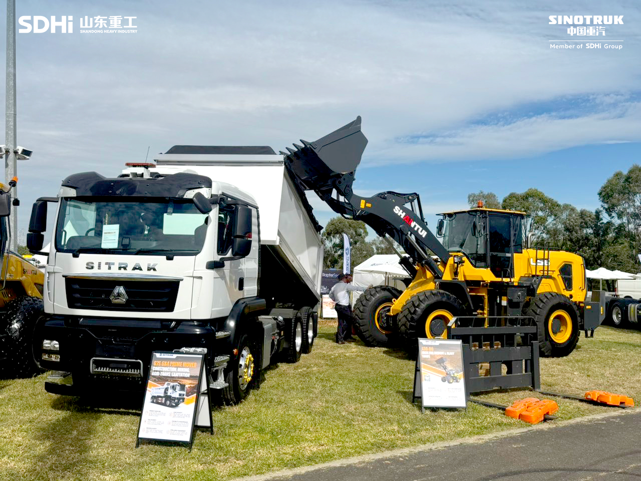 L56-B6装载机与中国重汽SITRAKG7S8x4铝合金自卸车共同展出,匹配成熟可靠的动力总成系统,在重载工况下保持稳定牵引力输出与优异燃油经济性。